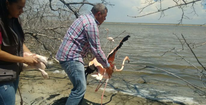 Seis flamencos rosados (Phonicopterus ruber) de aproximadamente cuatro años fueron liberados en el área protegída de Musichi.