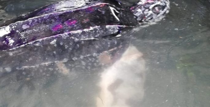Die Schildkröte mit 130 kg Gewicht sind in kritischem Zustand angekommen, mit schweren Wunden an den Flossen, insbesondere mit nekrotischem Gewebe an der linken Flosse.; Diagnose, für die Fachkräfte nach dem Debridement eine Behandlung mit Antibiotika und Flüssigkeitszufuhr begannen, Desinfektion und Heilung von Tierwunden.